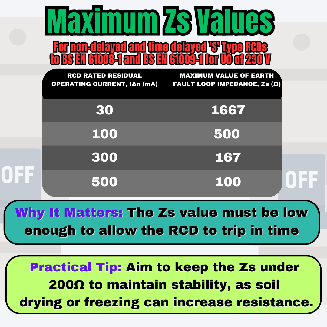 So for a 30mA RCD to operate correctly & safely we need the Z value to be equal to or less than 1,667Ω.