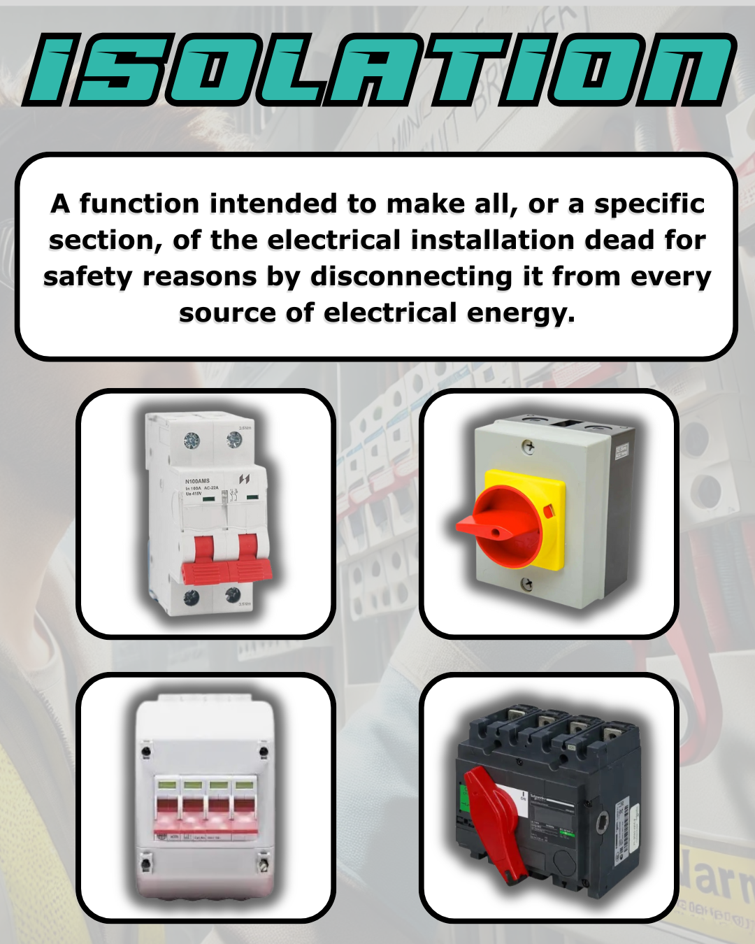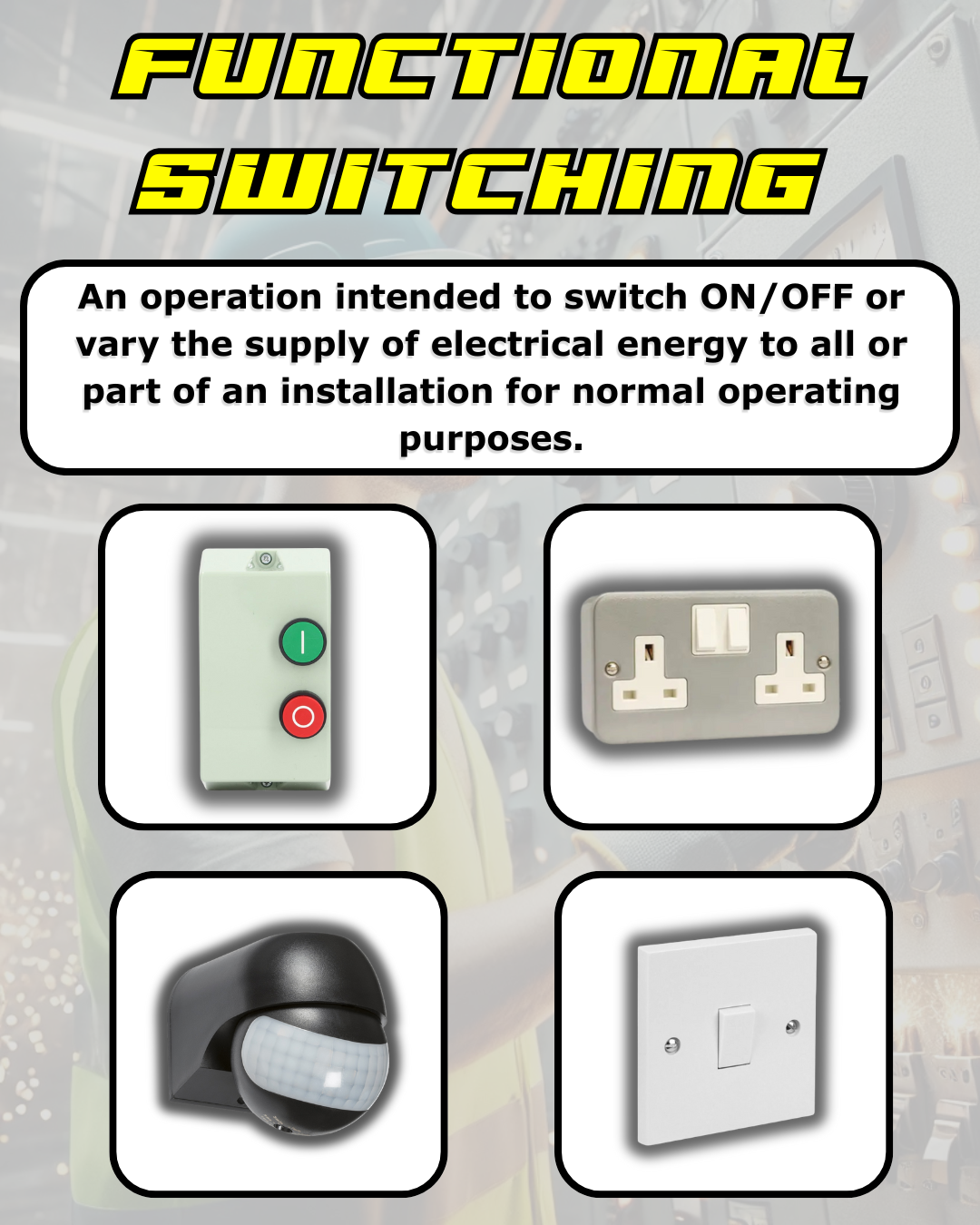 Functional switching is the everyday control of electrical equipment-turning it on or off during normal use. It's not about safety, unlike isolation or emergency switching.