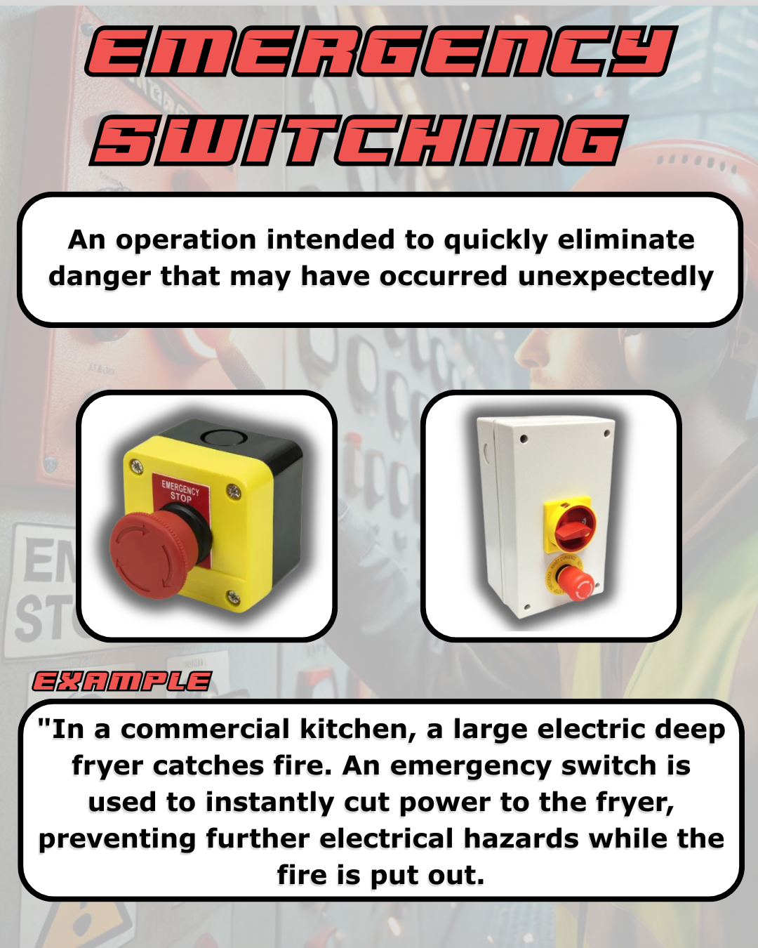 - Emergency Switching is used to quickly cut off power to eliminate danger. It is typically used for electrical hazards, such as a person receiving an electric shock or a fire starting in electrical equipment. For example... A large isolator switch outside a machine room instantly disconnects power in case of an electrical fault.