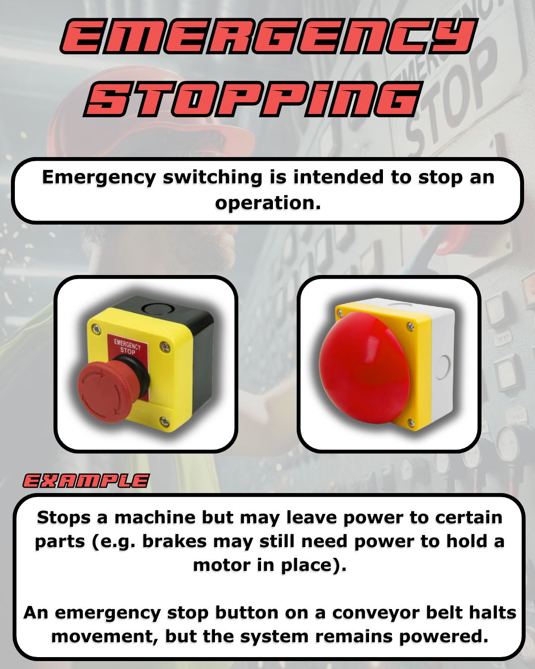- Emergency Stopping is used to halt the operation of a machine while keeping power supplied to safety-critical components. It is primarily for mechanical hazards rather than electrical ones. Emergency stop buttons are commonly seen on machinery where stopping moving parts can prevent injury without fully cutting power.