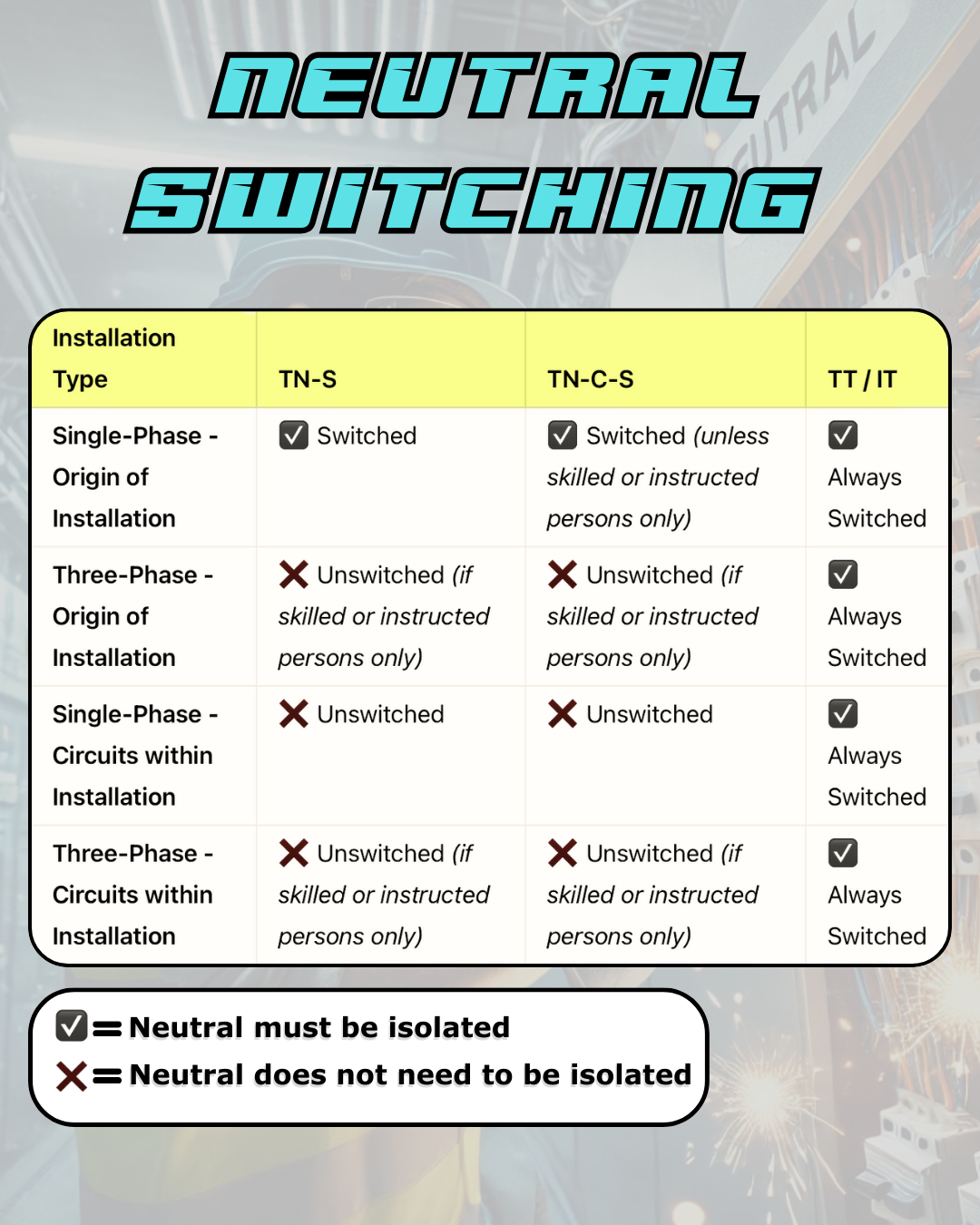 For example, in TT and IT systems, the neutral must always be isolated for safety. In TN-S and TN-C-S systems, it's usually left connected to maintain a stable return path. Incorrectly switching the neutral can cause floating voltages, instability, or loss of PME earthing-posing serious safety risks.